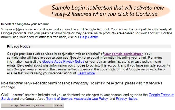 After you click to continue, we recommend immediately go to... Settings - Accounts - Google Account Settings ...and change "Multiple sign-in" under personal settings to "ON". You do this by clicking "Edit" and checking all four boxes under the "ON" selection. If you have a Gmail account already, you will want to log in there as well, and turn on the Multiple sign-in feature. There are help screens and instructional videos available to assist you in using all of the features of Pasty-2 (or Northpines.net), as Pasty.NET was one of the earliest adopters of the Google Apps engine for email. If, after using these resources, you still need assistance, email support@pasty.net or call 337-0569 and we will be glad to answer your questions. The Pasty.NET Support Team, February 2011 |